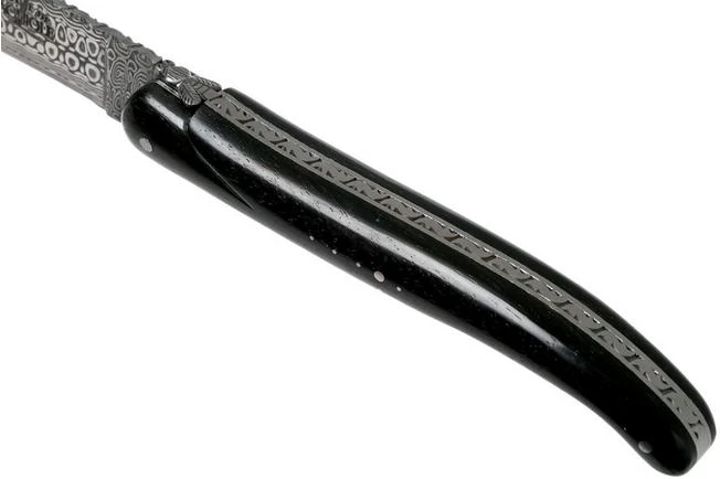 This stunning Forge de Laguiole-Laguiole knife has a handle made from ebony wood. The blade is made from high-end Damasteel from Sweden. In this case in the Munin pattern. You open the knife with two hands and a slipjoint keeps the blade open.