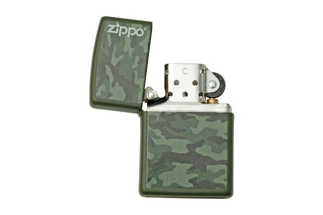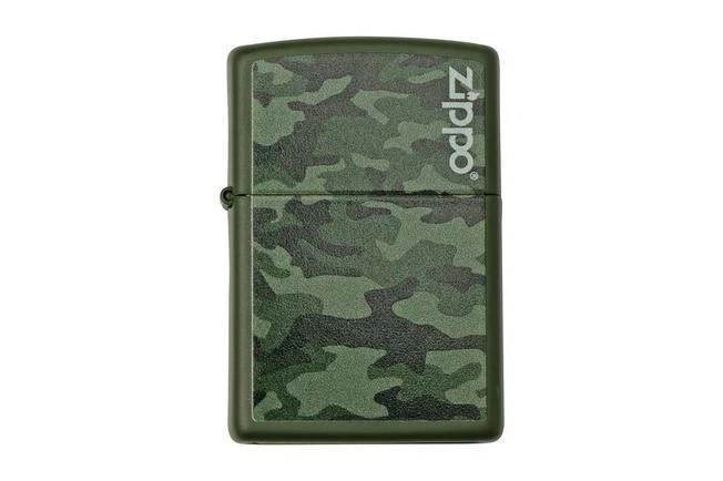 This *Zippo lighter is enhanced with a camo design. The rest of the lighter is matt dark green.